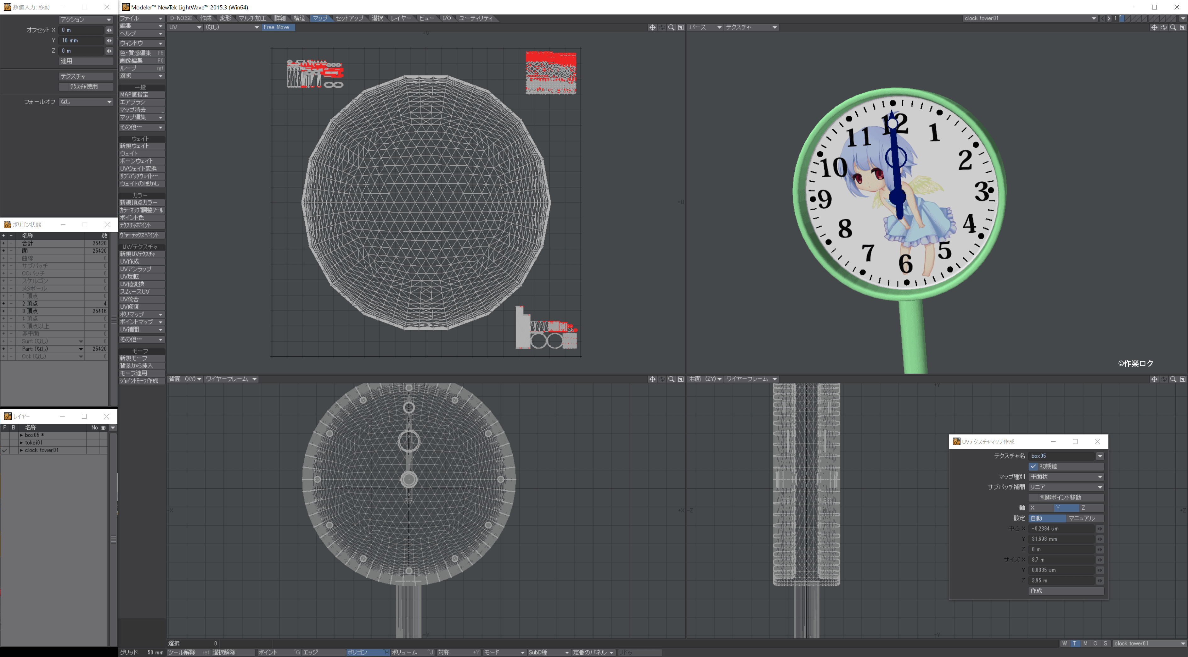 デジコミ講座 2017年9月5日(火)LightWave3D「テクスチャー&サブパッチ編」開催しました 9月 9, 2017 最終更新日時 : 9月 9, 2017 d-noise 2017年9月5日(火) 11:30~18:00 担当講師:小高みちる 「LightWaveちょー入門編」でモデリングがちょっとできるようになったところで、「模様を貼り付けてみたい!」という欲求にかられた方々が受講に来てくださいました^^ テクスチャーは2度目の受講という方もいて「今回こそ家に帰って自分だけでできそう!」と嬉しそうに言って頂きました。 これで、同じ時計は何度も描かなくていいんだ!の実感を持っていただくことができたみたいです。